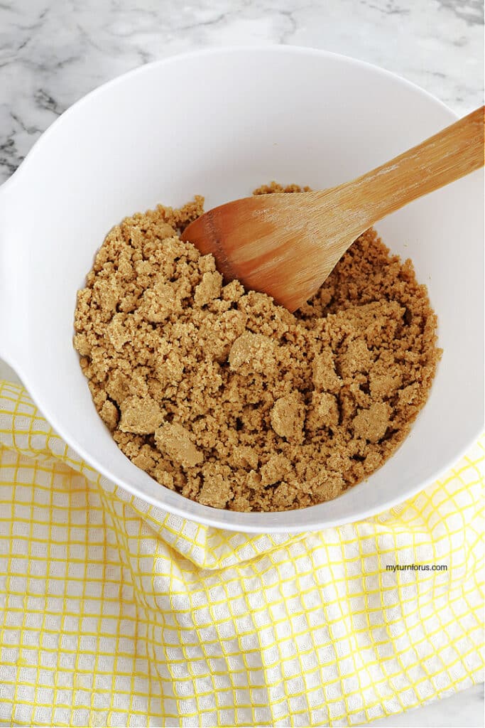 - Stir together the graham cracker crumbs, brown sugar and butter in a medium bowl.