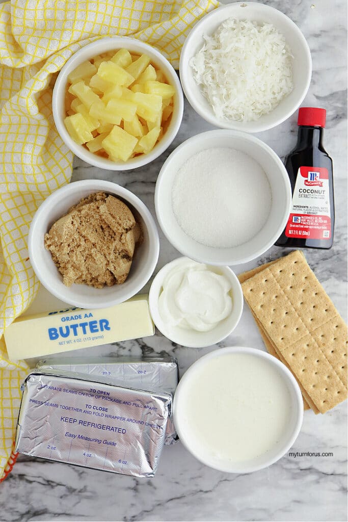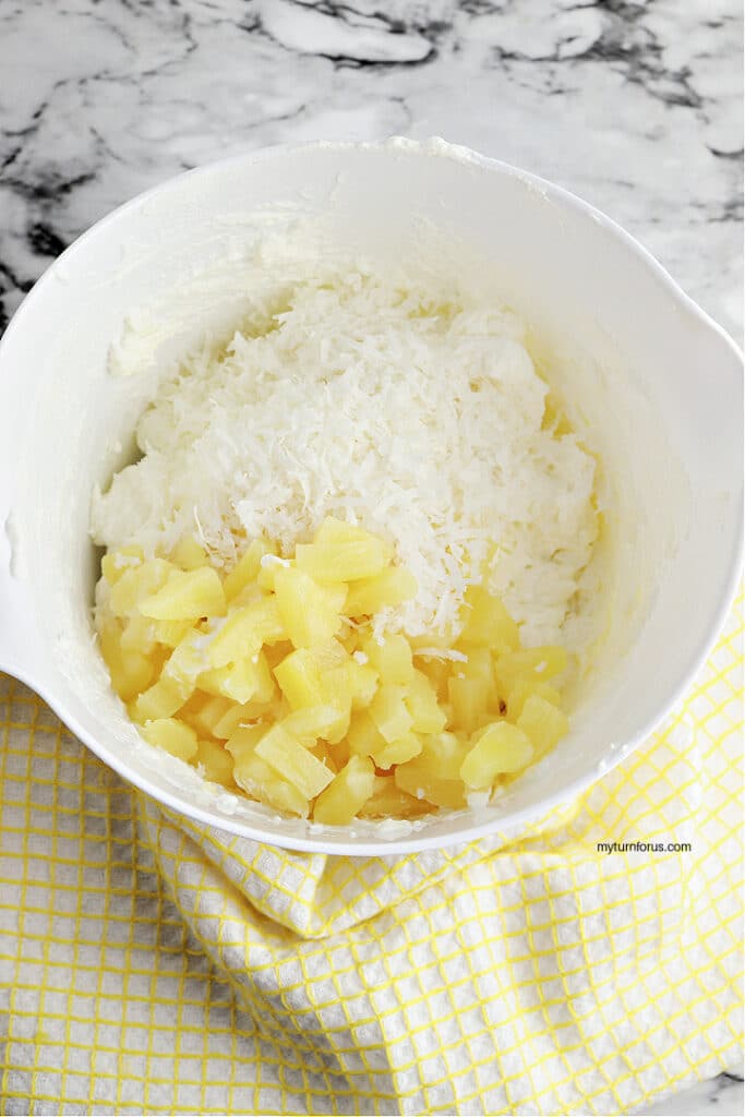 - Add one cup of pineapple tidbits and ½ cup sweetened coconut flakes to the pina colada cheesecake mixture. Fold in until well mixed.