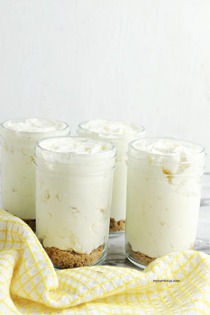 - Divide the mixture and evenly spoon into the jars over the top of the crust. Place all in the refrigerator to chill for at least four hours.