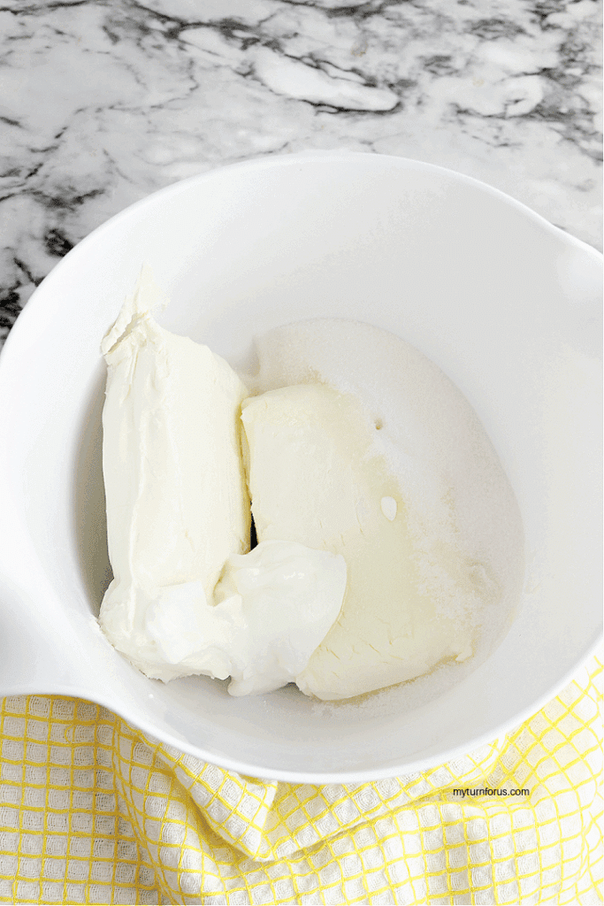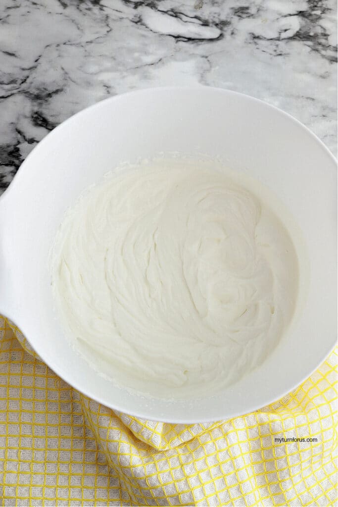 - In a medium bowl, beat the heavy whipping cream on high for four to five minutes, until stiff peaks form. Set aside.