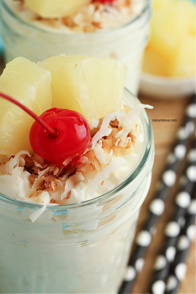 When the coconut is cool, remove the cheesecake jars from the refrigerator and top with more pineapple tidbits, toasted coconut, and a maraschino cherry before serving.
