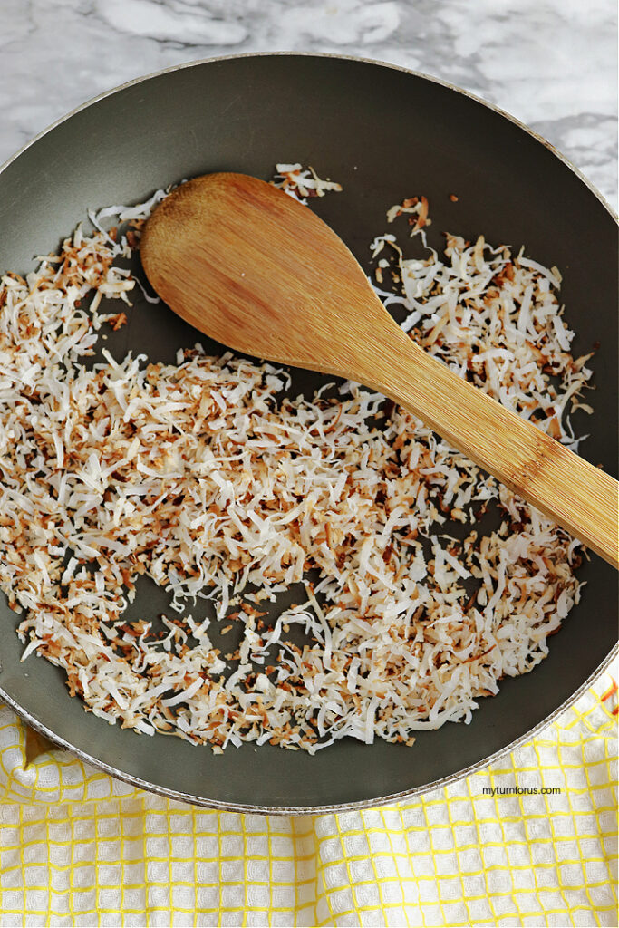 - When ready to serve, place ¼ cup coconut in a skillet and cook over medium low heat. Stir constantly until the coconut is golden brown, then immediately remove from heat and transfer to a bowl to cool.
