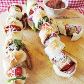 All the favorite Pizza Toppings skewered on a Kabob and wrapped in pizza dough.   Served with homemade pizza sauce.