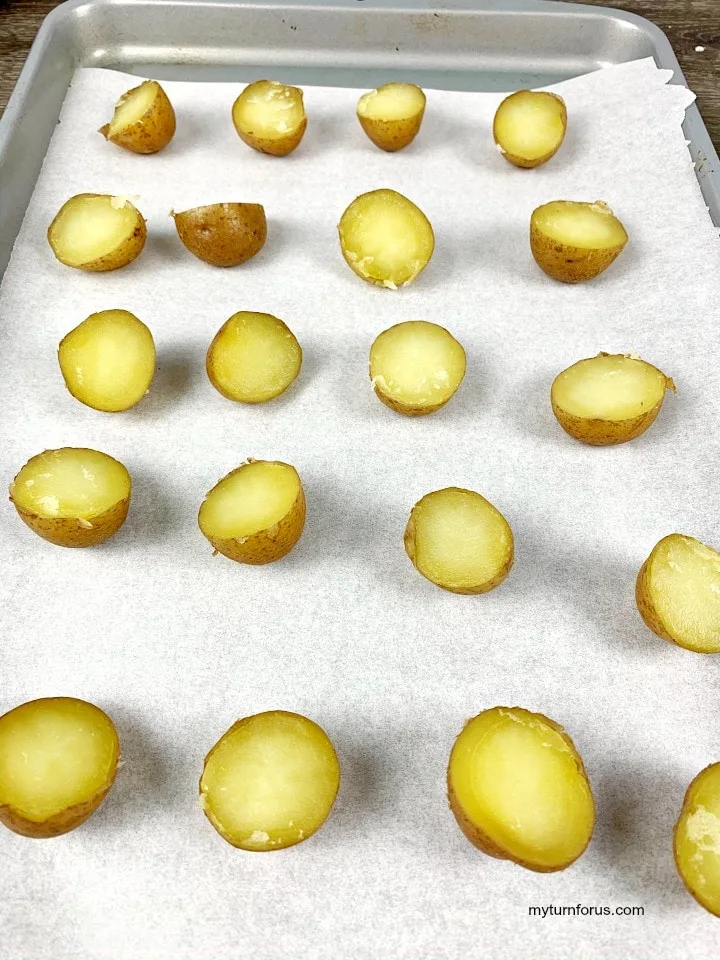 - Cut each of the red potatoes in half and place them on a baking sheet lined with parchment paper.
