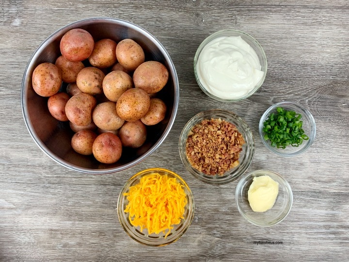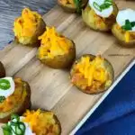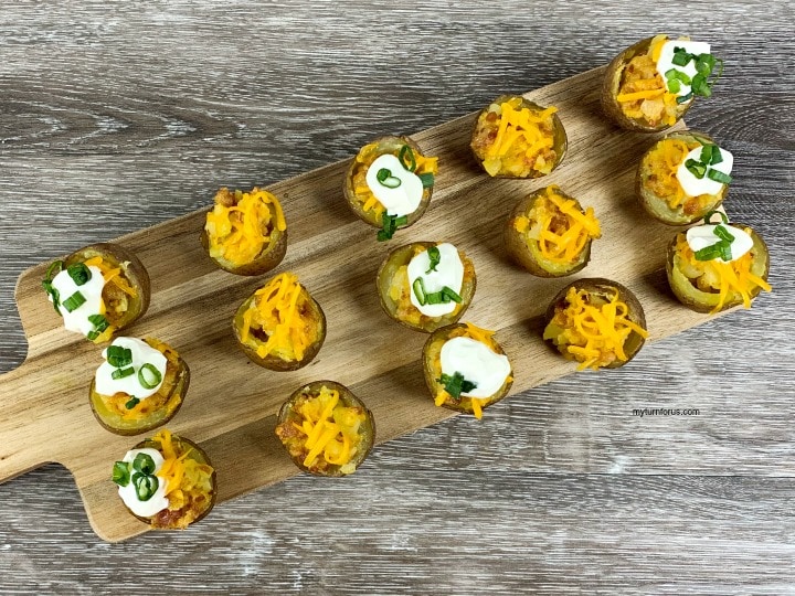 Make these mini potato skins with stuffed red potatoes. These little red potato skins are loaded potato bites topped with bacon, cheddar, sour cream, and green onions.