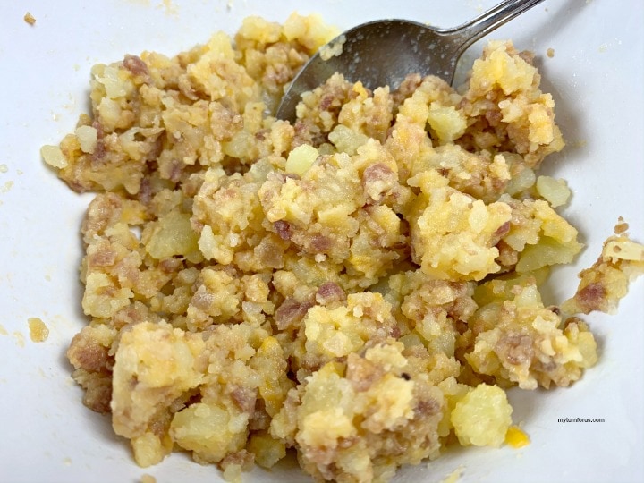 Add the cheddar cheese, bacon bits & butter to the bowl with the meat of the potato insides. Mix very well breaking up the chunks.