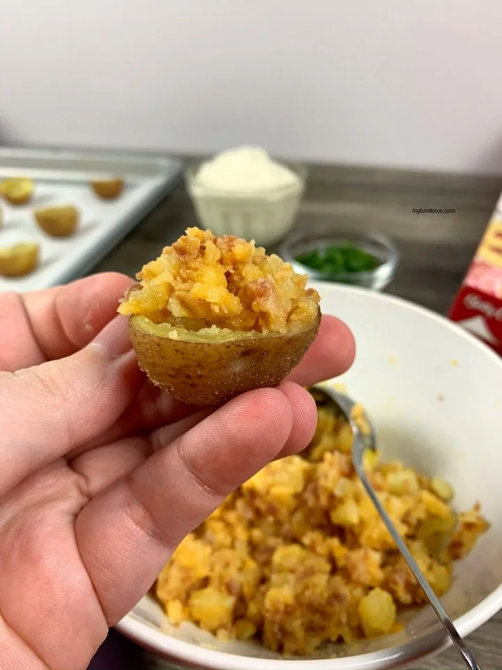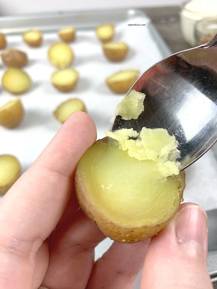 - Use a small spoon to scoop out the inside of each potato half. Place the scooped out meat of the potatoes in a medium bowl.