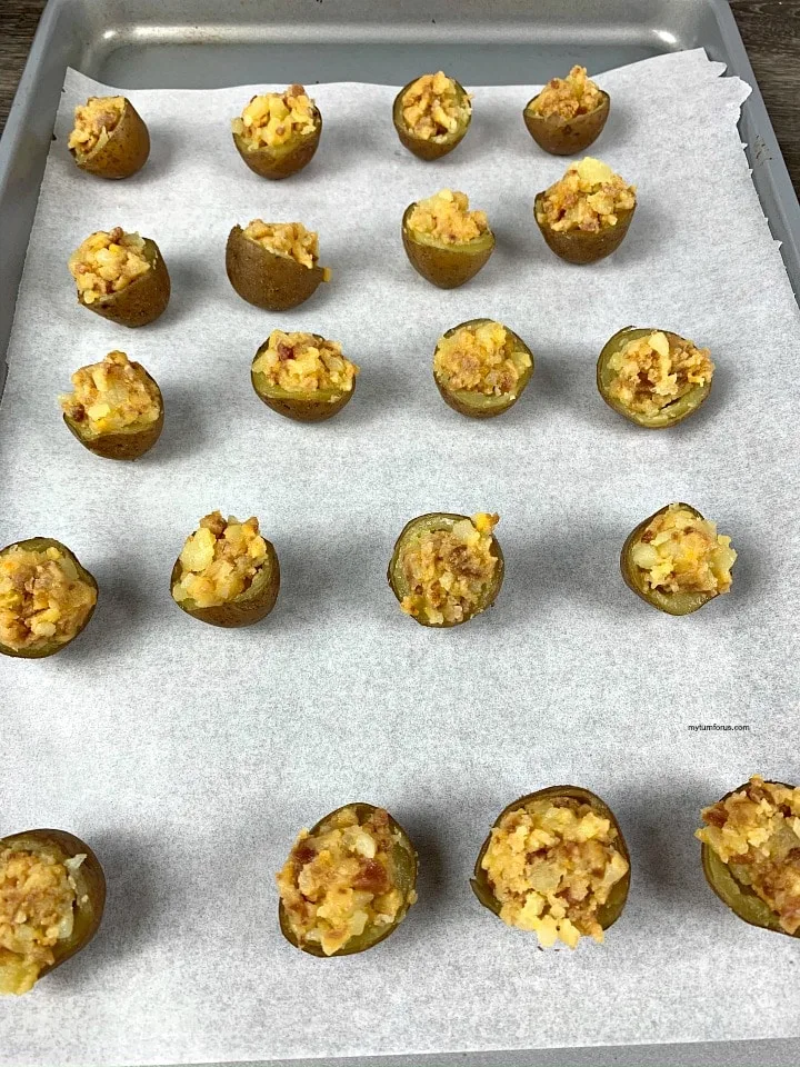 - Place the baking sheet with the stuffed red potatoes in the oven and bake for 10 minutes.