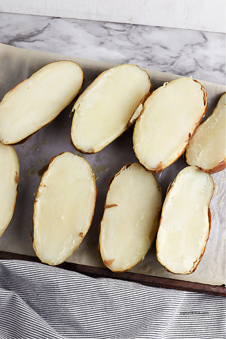 - Remove the potatoes from the oven and carefully slice each one in half.