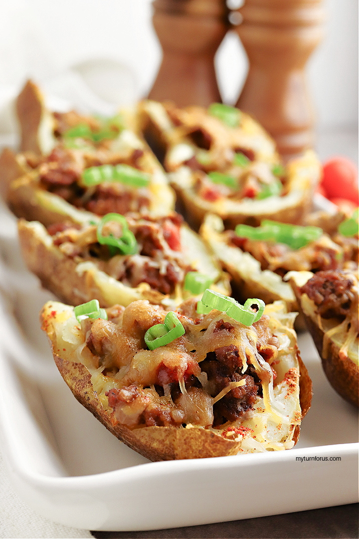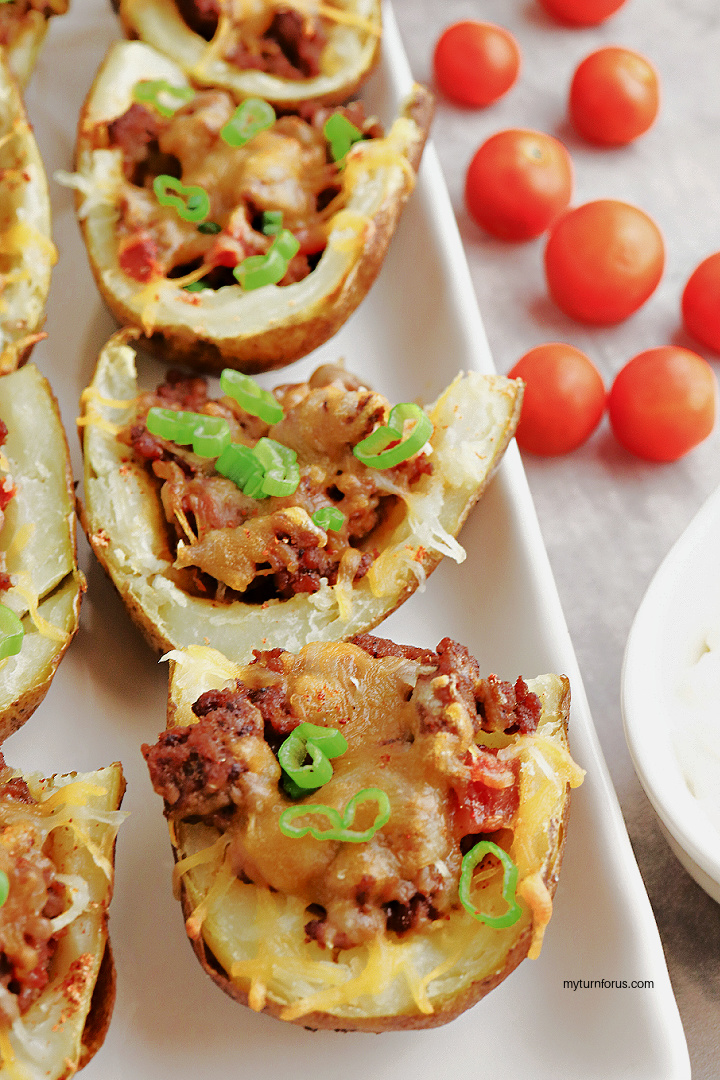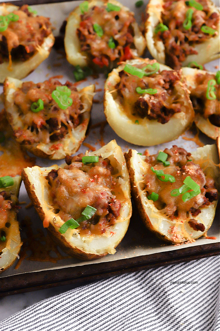 Looking for a tasty and unique taco idea? Look no further than these Potato Skin Tacos! These taco topped potato skins are loaded with seasoned taco meat and cheese. Turn a classic dish into a deliciously unexpected twist of Mexican stuffed potatoes for are for a fun and flavorful appetizer or meal.