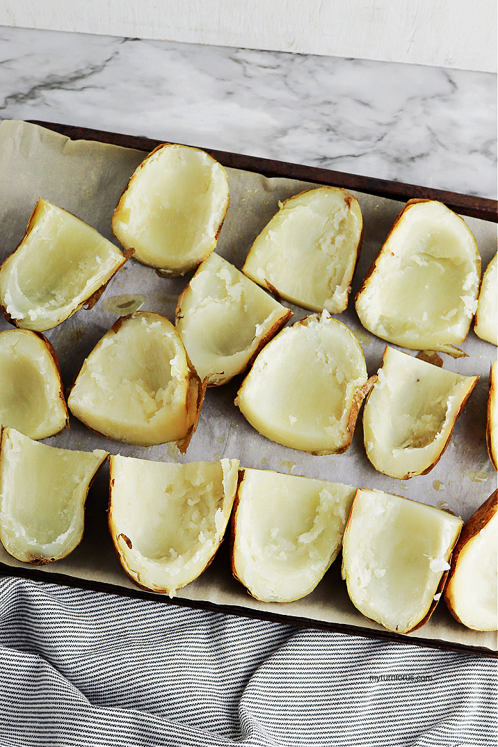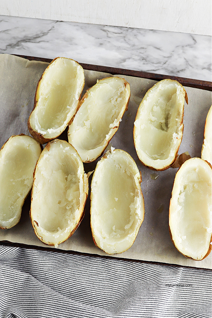 - Scoop out the center of each potato, leaving a thin layer of potato above the skin