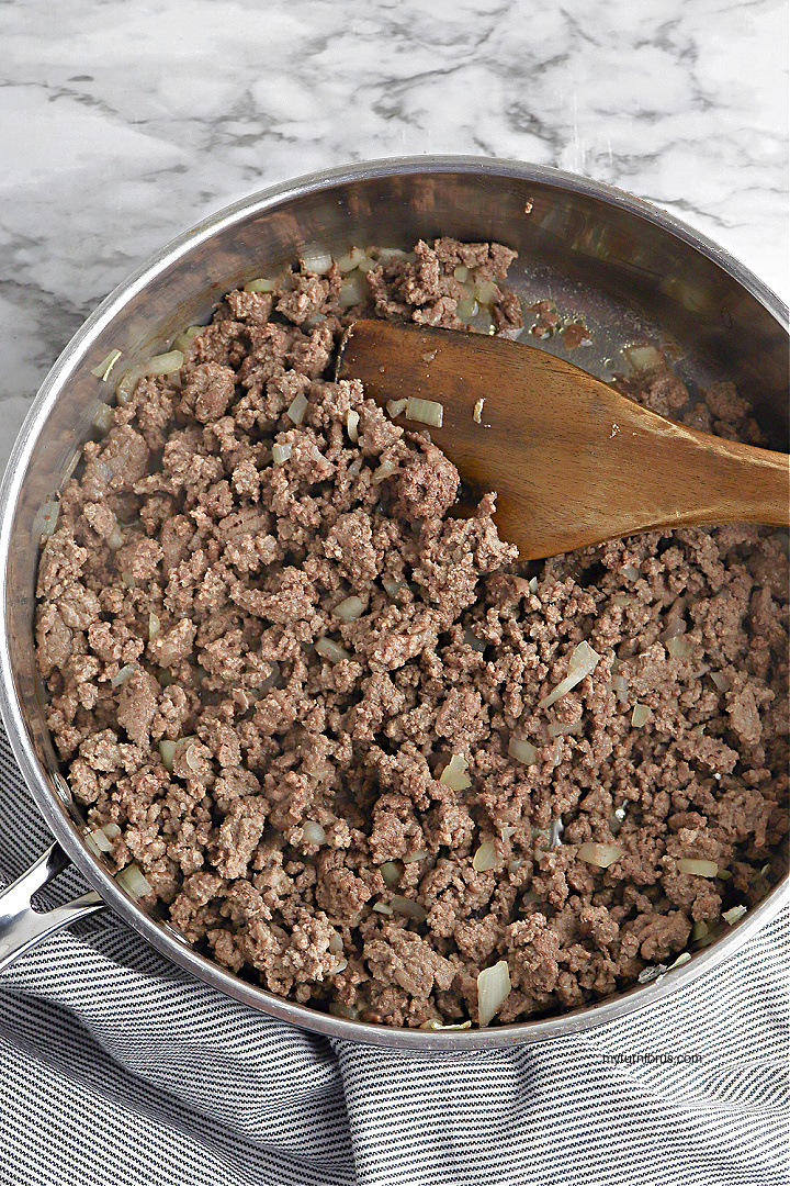 - While the potatoes are cooking, brown the ground beef in a large skillet with the onion.
