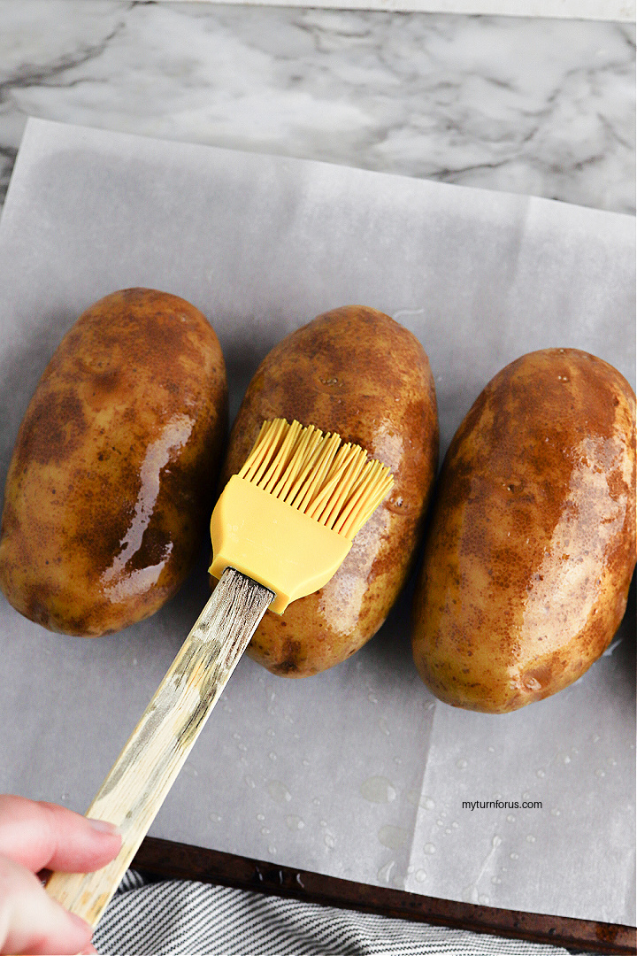 - Preheat your oven to 400° F. Line a baking sheet with parchment paper and poke holes in each potato with a fork. Brush each potato all over with the vegetable oil. Place the potatoes in the preheated oven and bake for 1 hour until tender.