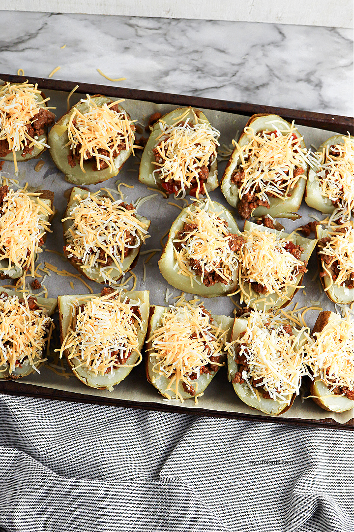 Top each potato with the shredded cheese. Return the pan to the oven and bake for 15 minutes, until the cheese is melted and the taco topped potato skins are crispy.