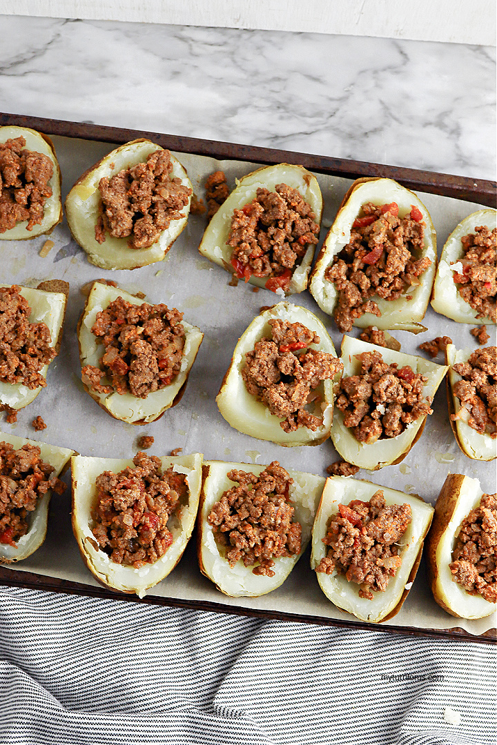 Top each potato skin half with the taco meat mixture using all of the meat.
