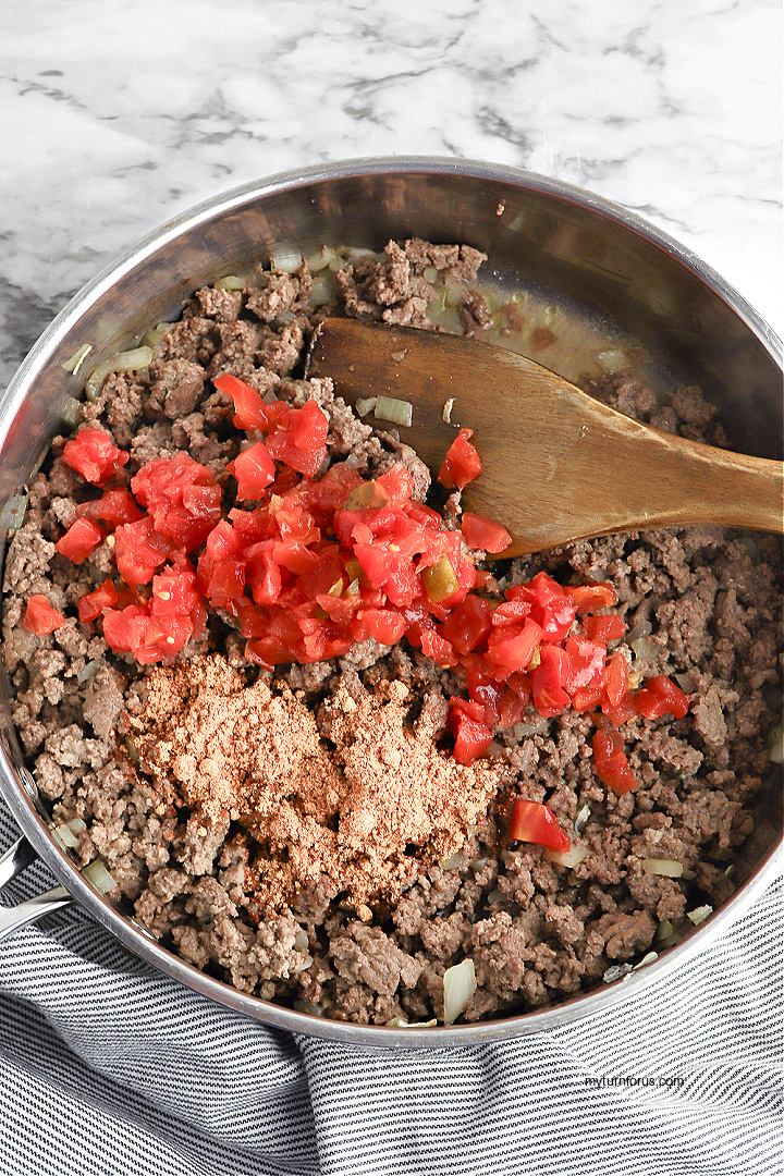 - When the meat is cooked completely, stir in the taco seasoning, water and diced tomatoes. Simmer for 10 minutes, until the sauce has thickened, then remove skillet from heat.
