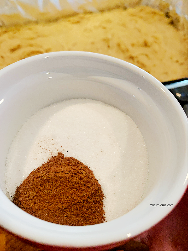 Add of ¼ cup of sugar and 1 teaspoon cinnamon in a small bowl and mix.