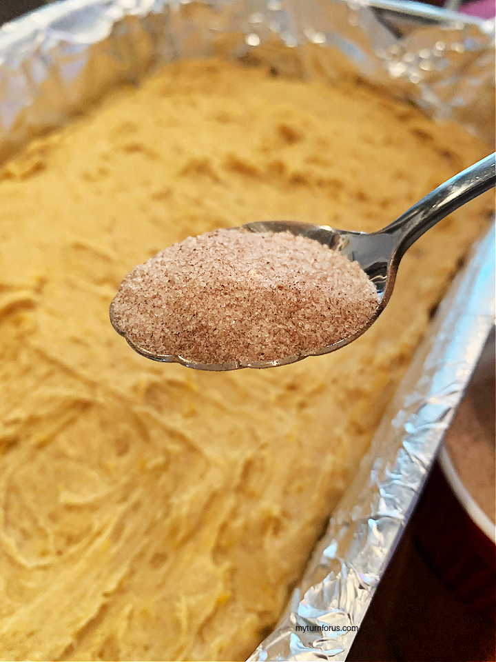Sprinkle the topping evenly over the Pumpkin Snickerdoodle Bar batter.