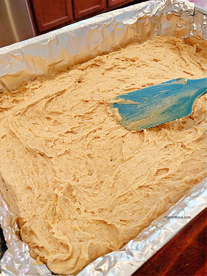 Place the pan of unbaked Pumpkin Snickerdoodle Blondies in the preheated oven and bake for 20-25 minutes.
