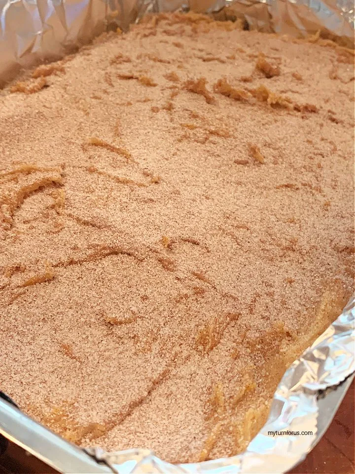 - Add of ¼ cup of sugar and 1 teaspoon cinnamon in a small bowl and mix. Sprinkle the topping evenly over the Pumpkin Snickerdoodle Bar batter.