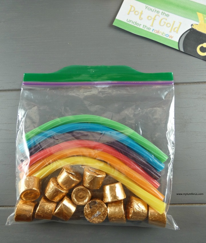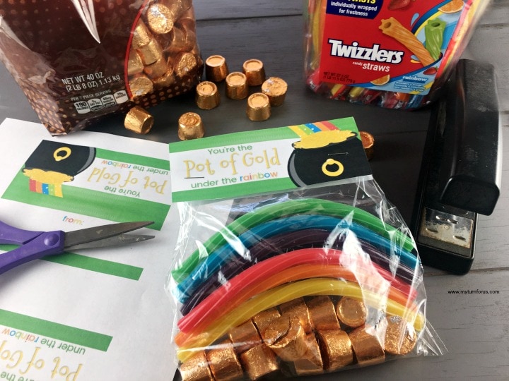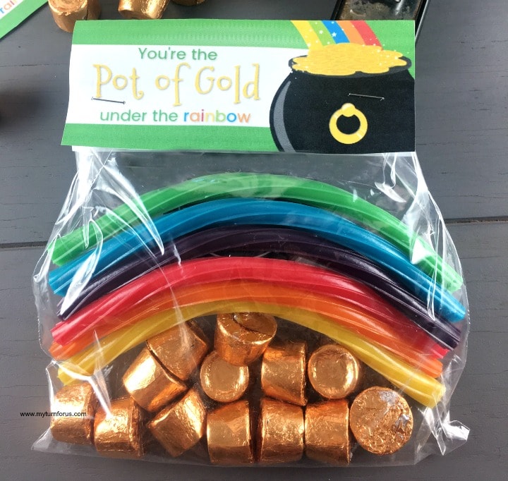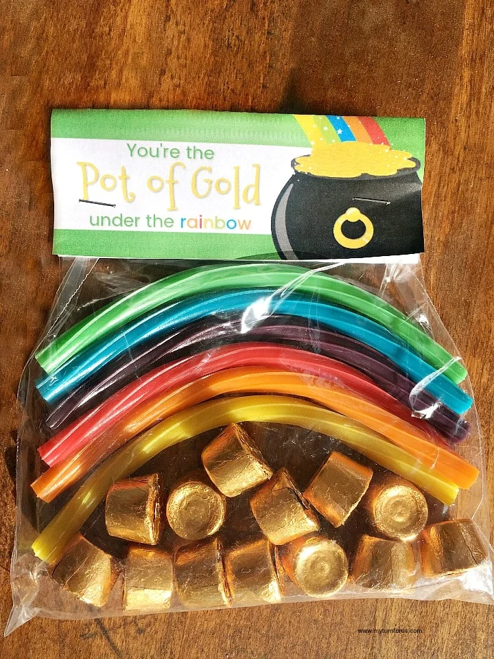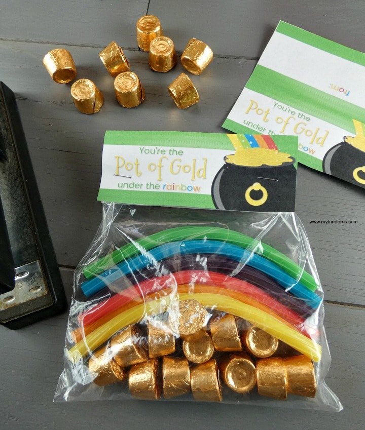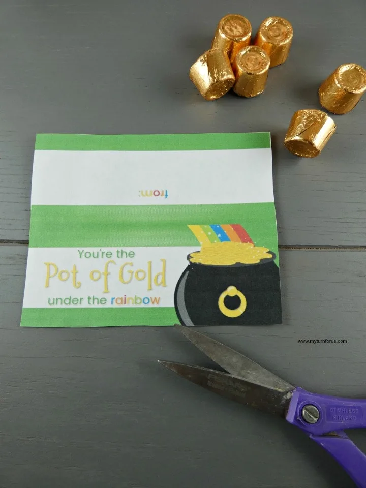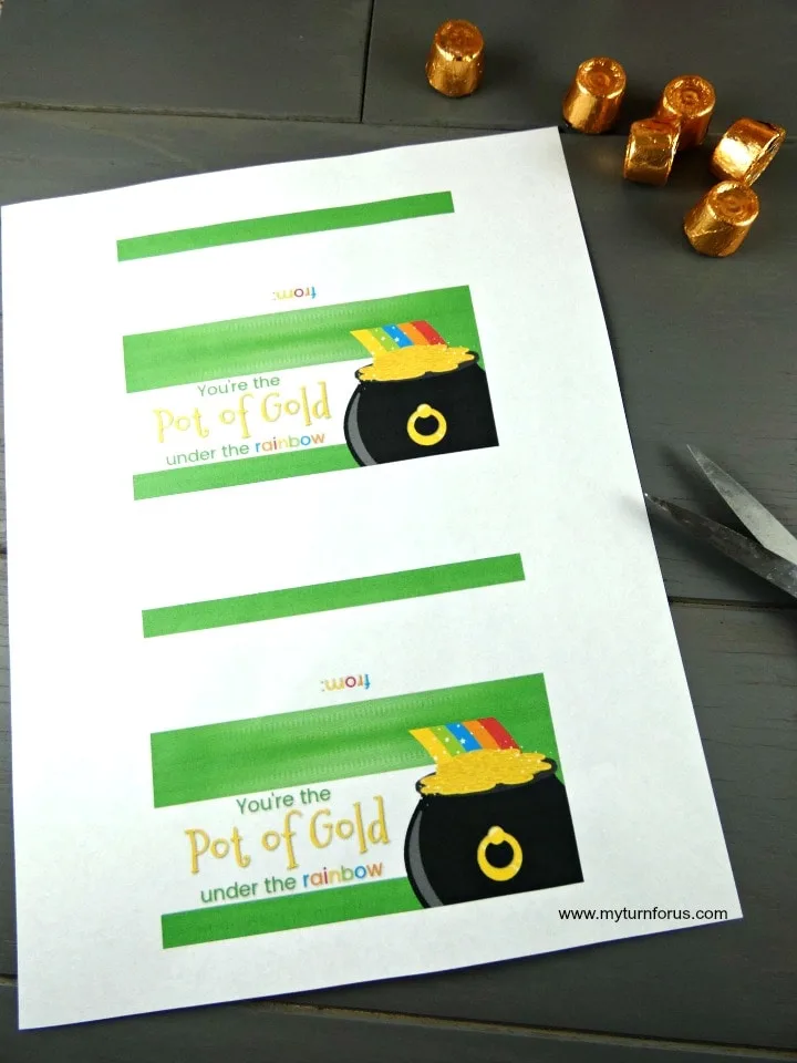 - There are two toppers on each sheet of these St Patrick’s Day Treat Bags Printables. Cut each one out with craft scissors and fold in half, so the words “You’re the Pot of Gold under the Rainbow” are on one side and “From” with the blank spot for a name on the other.