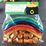 There are two toppers on each sheet of these St Patrick’s Day Treat Bags Printables. Cut each one out with craft scissors and fold in half, so the words “You’re the Pot of Gold under the Rainbow” are on one side and “From” with the blank spot for a name on the other.