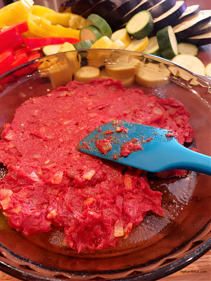 Spray a round pan (deep dish pie plate works great) with cooking spray.   Spread the tomato paste mixture along the bottom of the dish.