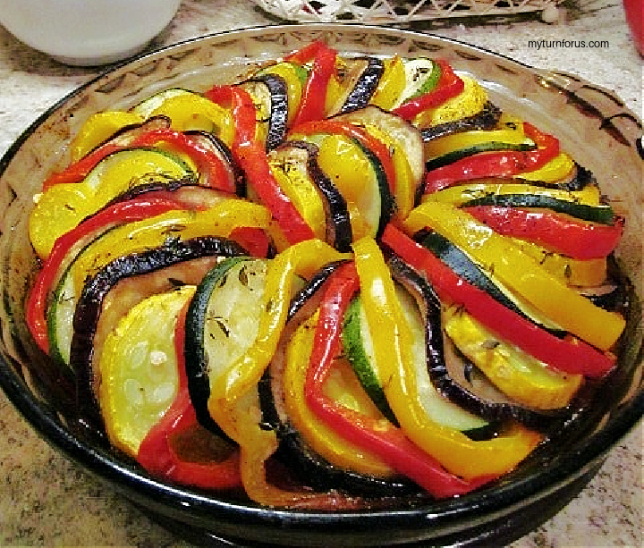 Zucchini and yellow squash and eggplant are abundant right now in my garden.   I searched my cookbooks and notes and decided the best way to use these beautiful and healthy veggies is in a delicious ratatouille. But even though regular ratatouille has some amazing flavors but it doesn’t always look pretty or appetizing.