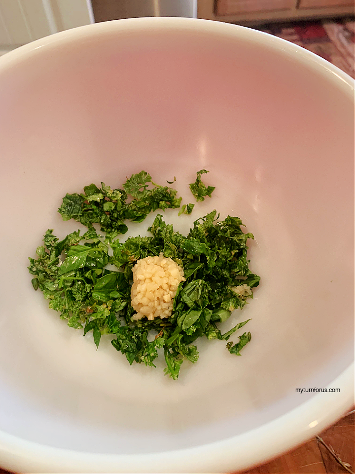 • Add the fresh herbs and garlic in a small bowl, add olive oil and mix well. Spoon the herb mixture on top of the tian ratatouille vegetables.