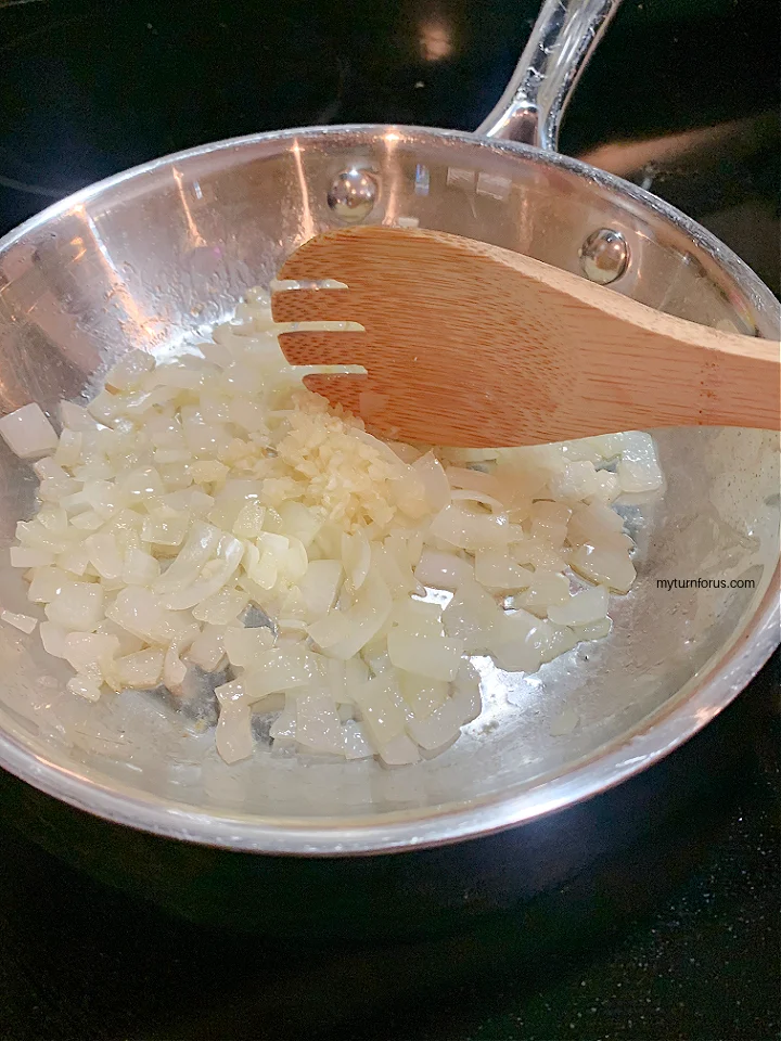 • Preheat your oven to 375° F. Heat a 2 Tablespoons of olive oil in a small skillet over medium heat. Then add the chopped onion and sauté until tender and translucent. Add the minced garlic and sauté for another minute.