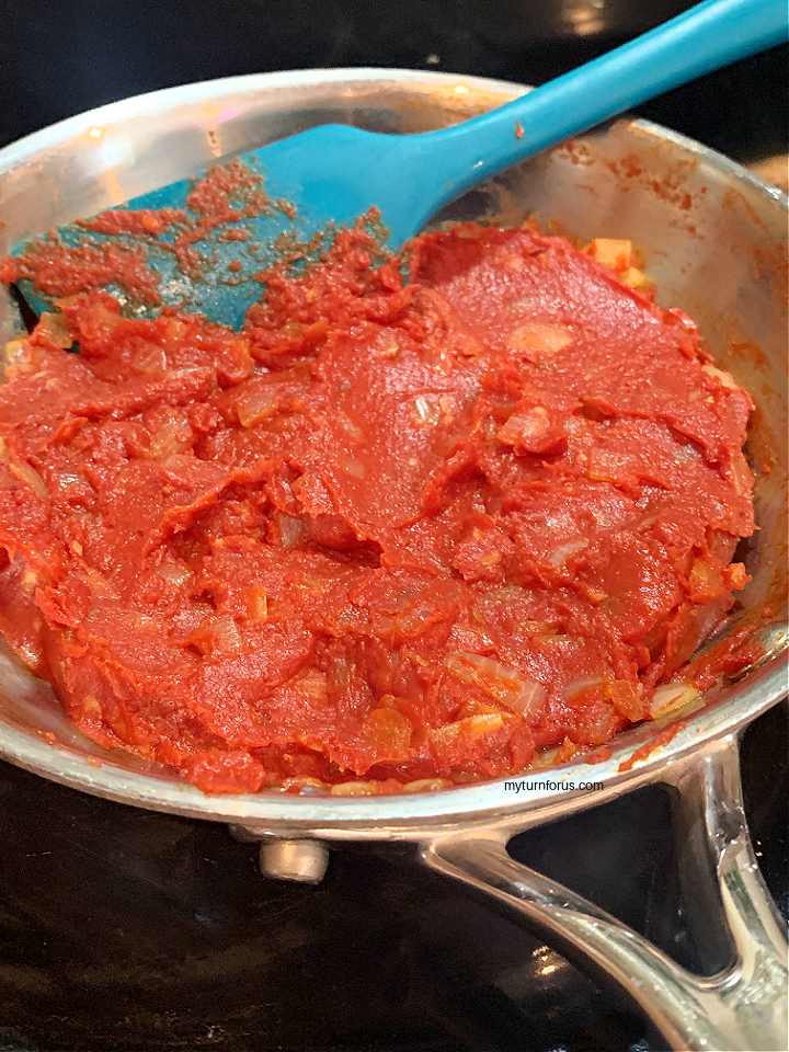 • Add the tomato paste and water and 1 Tablespoon of olive oil to skillet with onions and garlic. Mix completely while heating the tomato paste mixture. Season with salt and pepper.