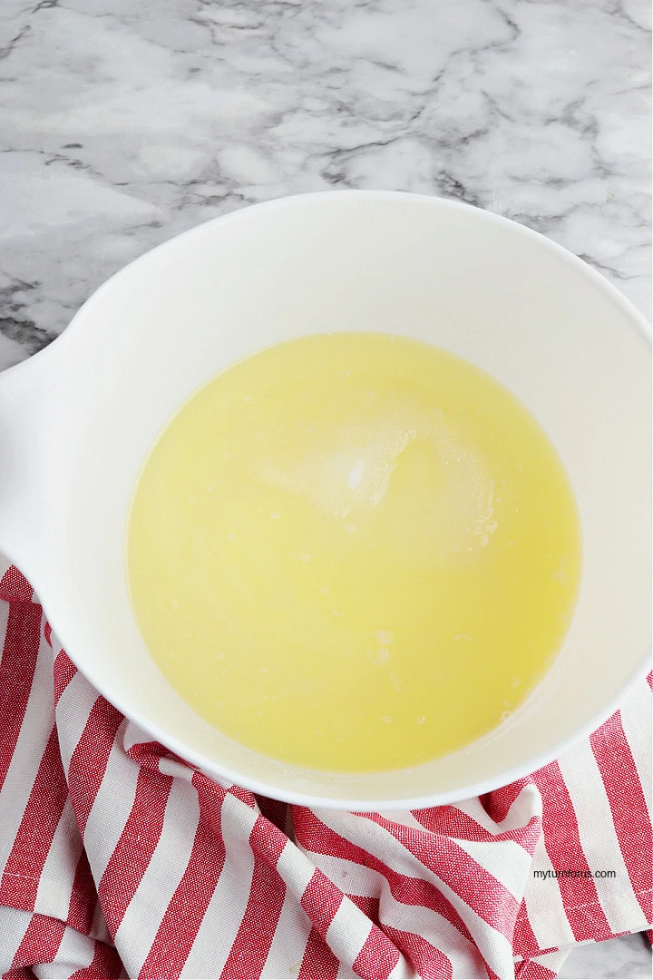 - Preheat your oven to 350° F and line a 9×9 baking pan with parchment paper and grease with nonstick cooking spray. In a large mixing bowl stir together the butter and sugar until well combined.