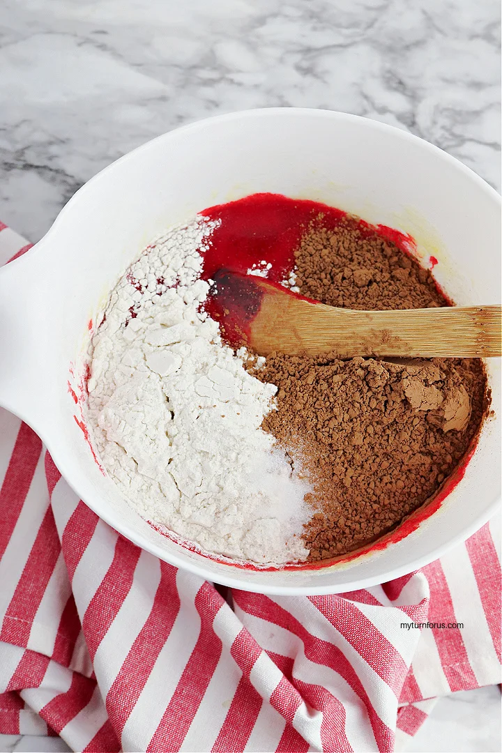 - Add the cocoa powder, flour and salt. Stir to mix.