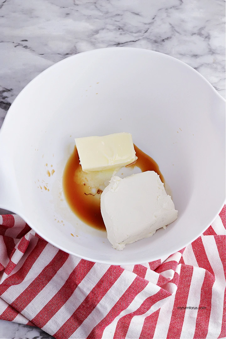 - Add the softened cream cheese, room temperature butter and vanilla extract in a mixing bowl. Using your mixer beat until smooth.