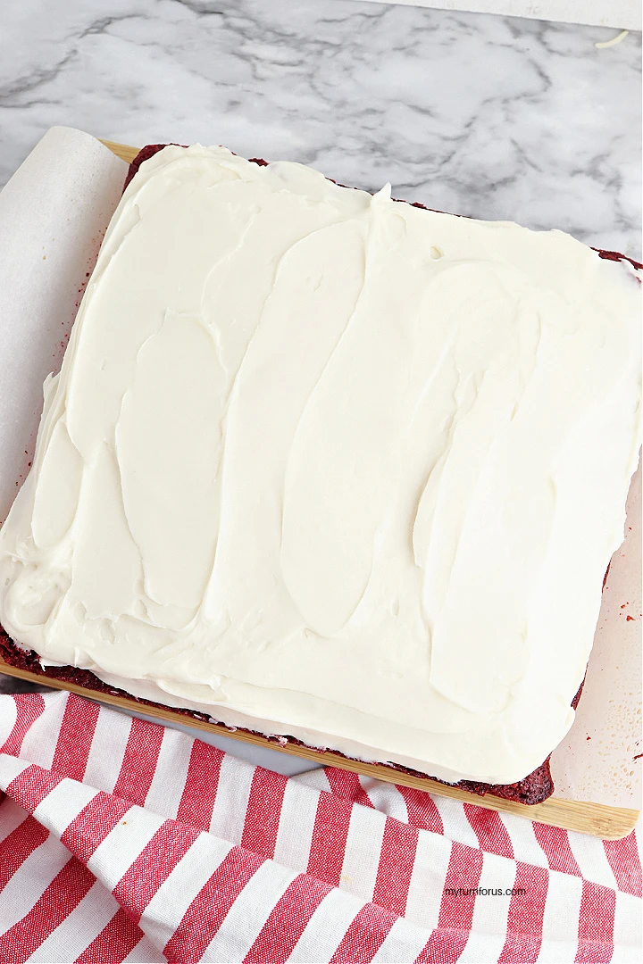 Remove the red velvet brownies from the pan using the parchment paper, place on cutting board. Make sure the brownies are cool and then spread the frosting on the top, coating completely.