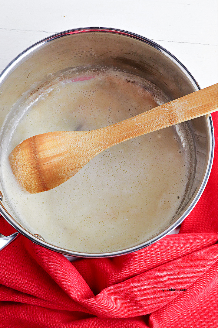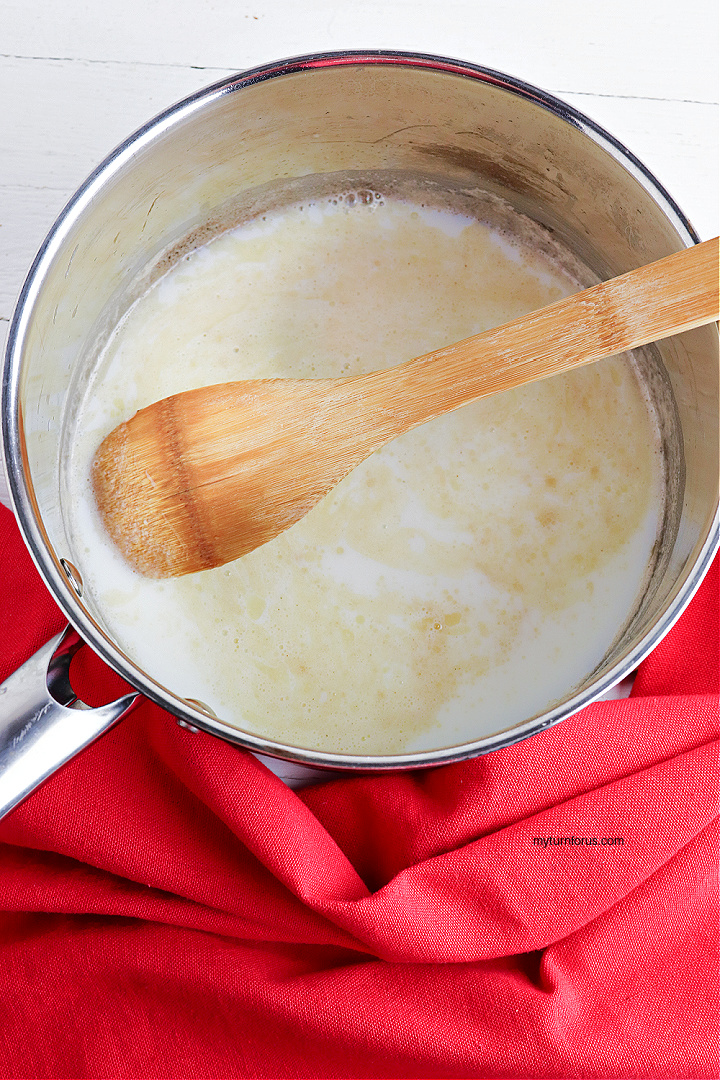 - Gradually pour the milk into the saucepan while whisking constantly to keep the mixture smooth. Bring it to a gentle boil over medium heat, then continue cooking and stirring for about 3 minutes until the sauce has noticeably thickened and coats the back of a spoon.