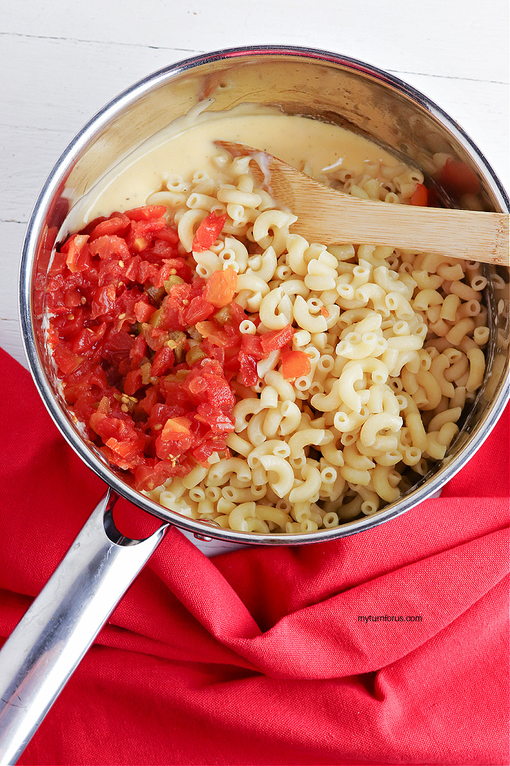 - Stir in the undrained Rotel tomatoes and the cooked, drained elbow macaroni. Gently fold everything together until the pasta is evenly coated in the creamy, cheesy sauce.