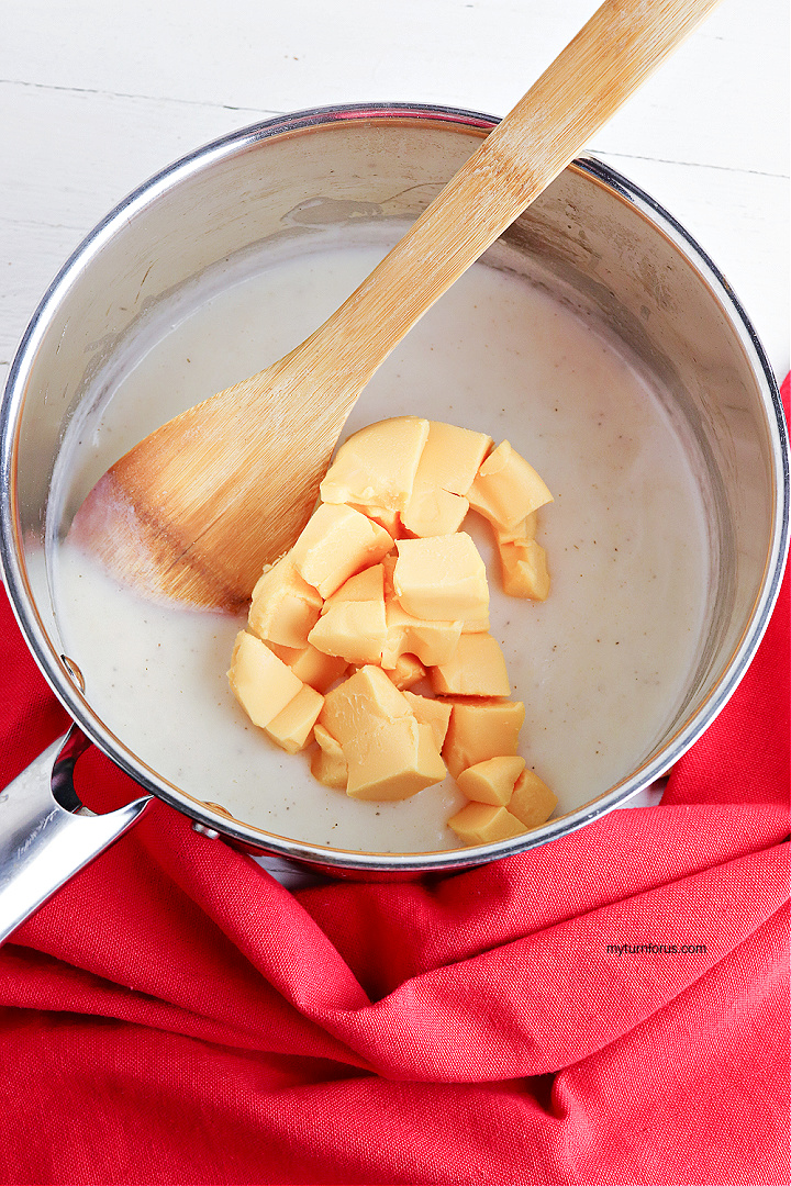 - Remove the saucepan from the heat and add the cubed Velveeta. Stir continuously until the cheese is completely melted and the sauce is smooth and creamy.