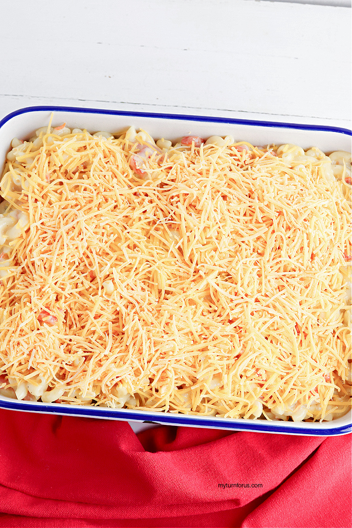- Top the macaroni and cheese evenly with the shredded sharp cheddar, then place the dish in the preheated 350°F oven.