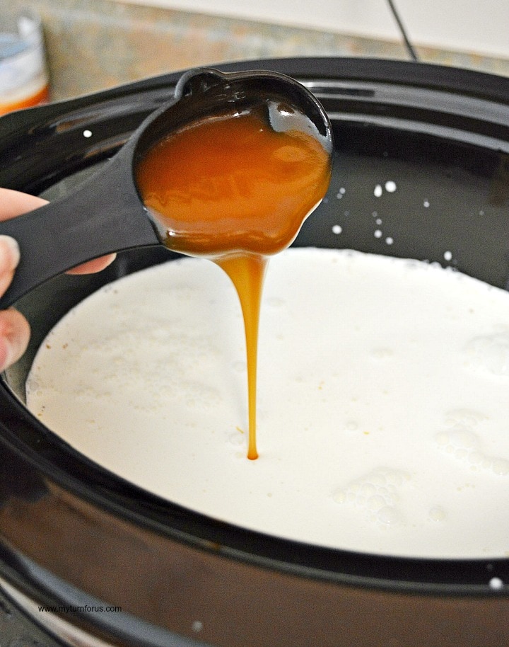 - Next, pour in the caramel sauce. Cook on LOW for 2–3 hours, stirring occasionally, until the chocolate is fully melted and everything is smooth and steaming hot.