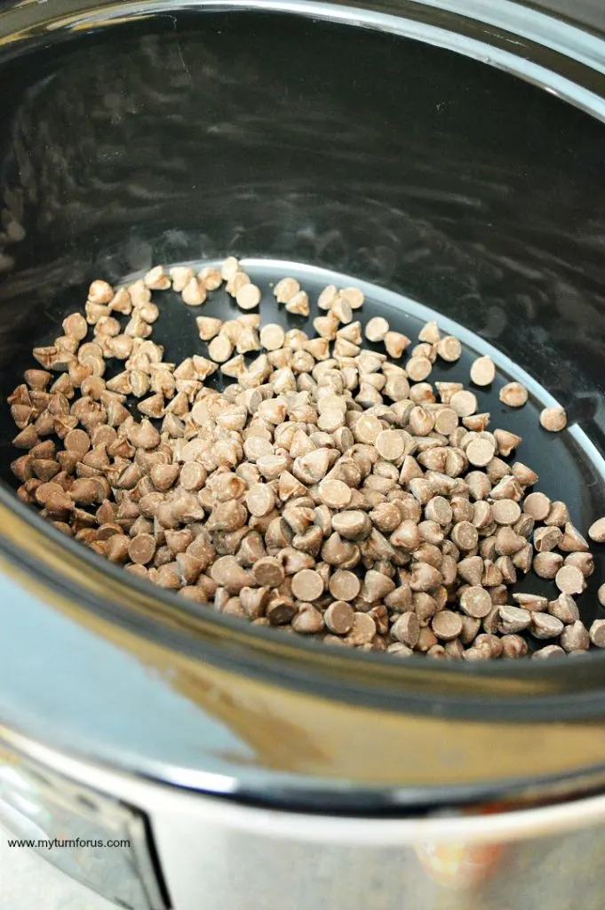 Add the chocolate chips, milk, and heavy cream to the bottom of your slow cooker.