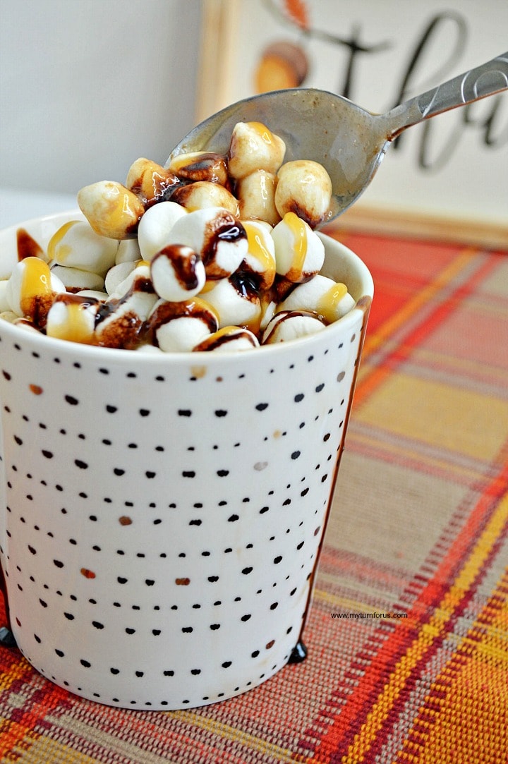 - Ladle into mugs and top with a handful of miniature marshmallows, then drizzle generously with extra salted caramel sauce and chocolate syrup.
