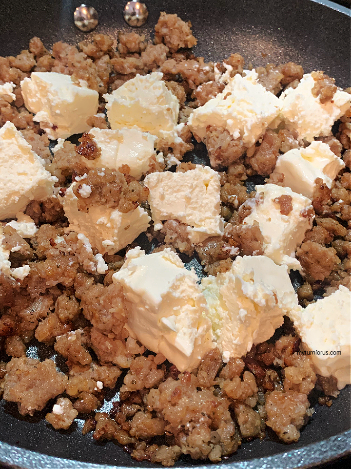 - Cut the cream cheese into squares and add to the cooked sausage while the skillet and sausage are still hot.