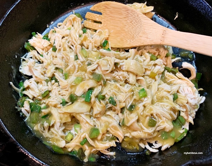 - Add the shredded chicken breast to the skillet and about 3 of the chopped green onions (save the last one for garnish). Stir to combine.
