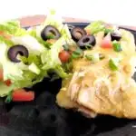 These skinny green chicken enchiladas contains white chicken breast, low fat cheese and lower calorie corn tortillas. All that great flavor we love but without the guilt. And we pair it with a flavorful green salad. And to help you and I stay on track this can be a make ahead casserole dish for those busy weeknight dinners.
