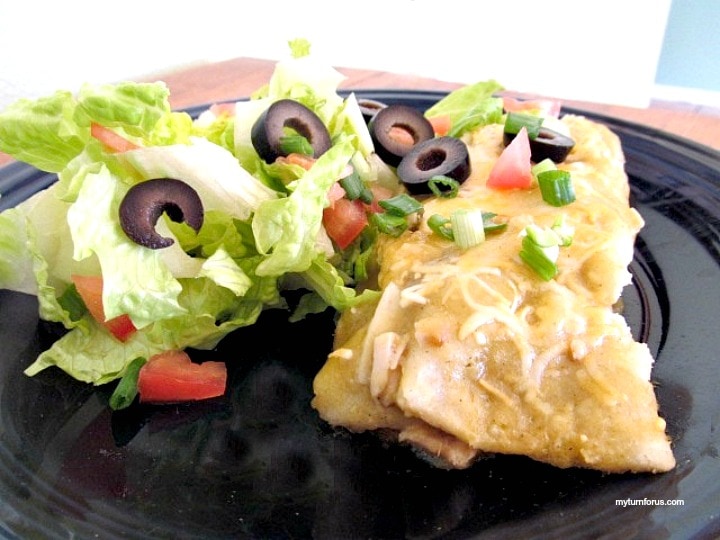Remove from oven and serve with lettuce, tomatoes, black olives, chopped onions and avocado. This recipe serves 4 people with 2 enchiladas each. We made a few healthier changes to make these skinny Chicken Green Enchiladas. This recipe for chicken enchiladas with green sauce have all that great flavor you love but without the guilt.