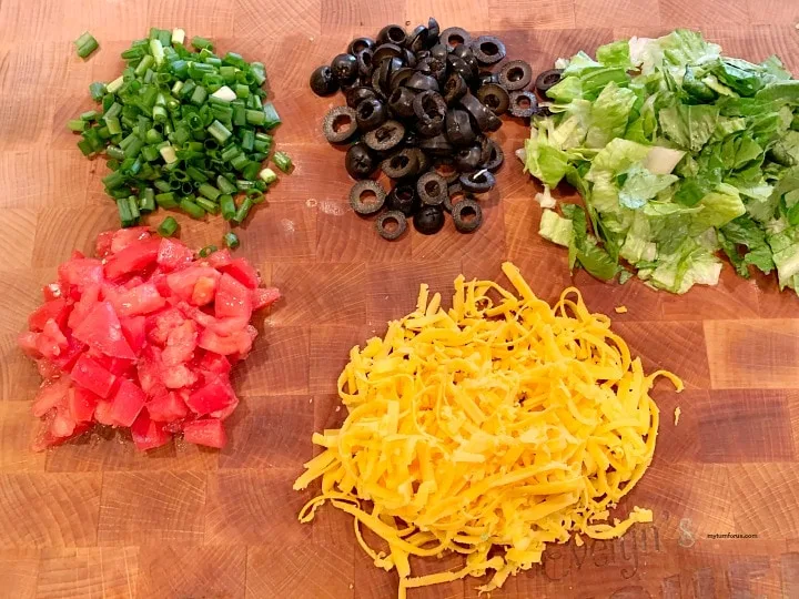 - Remove from oven and serve with lettuce, tomatoes, black olives, chopped onions and avocado.