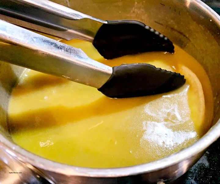 - Pour the remaining enchilada sauce in a separate saucepan and heat. Dip a corn tortilla into the heated sauce just long enough to heat up the tortilla but not long enough for it to crumble.