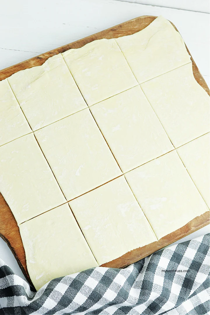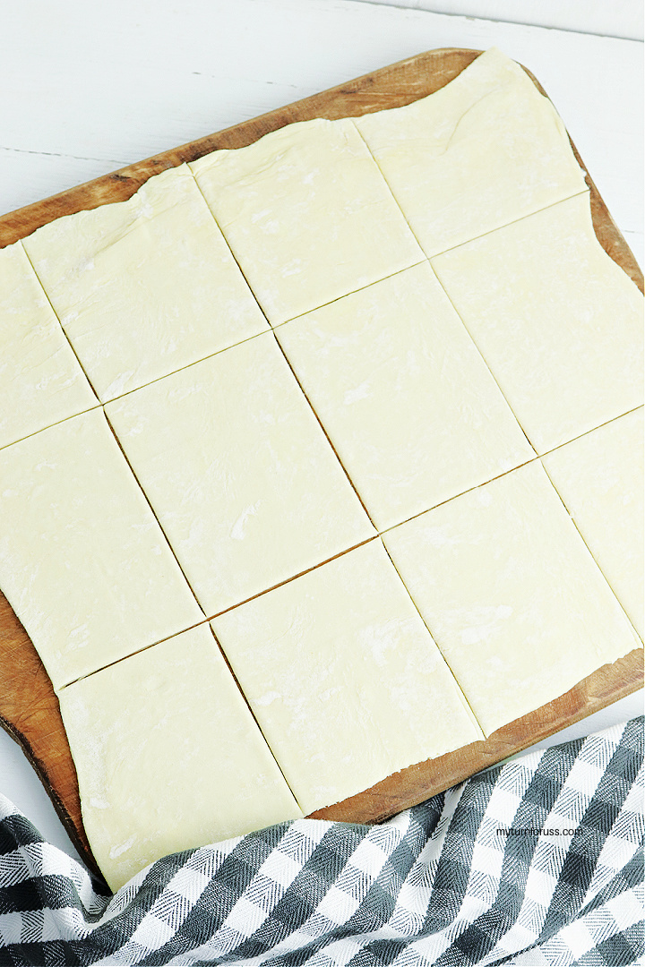 - On a lightly floured surface, gently unfold and roll one sheet of thawed puff pastry until it’s about ¼-inch thick. Using a pizza cutter or sharp knife, cut the sheet into 12 equal rectangles (a 3×4 grid works perfectly).