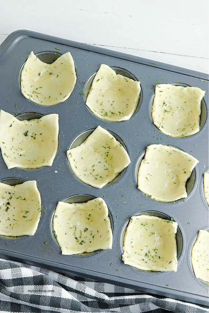- Brush the puff pastry in each muffin cup with melted butter, then sprinkle lightly with garlic powder and dried parsley for an extra flavor boost and golden finish.